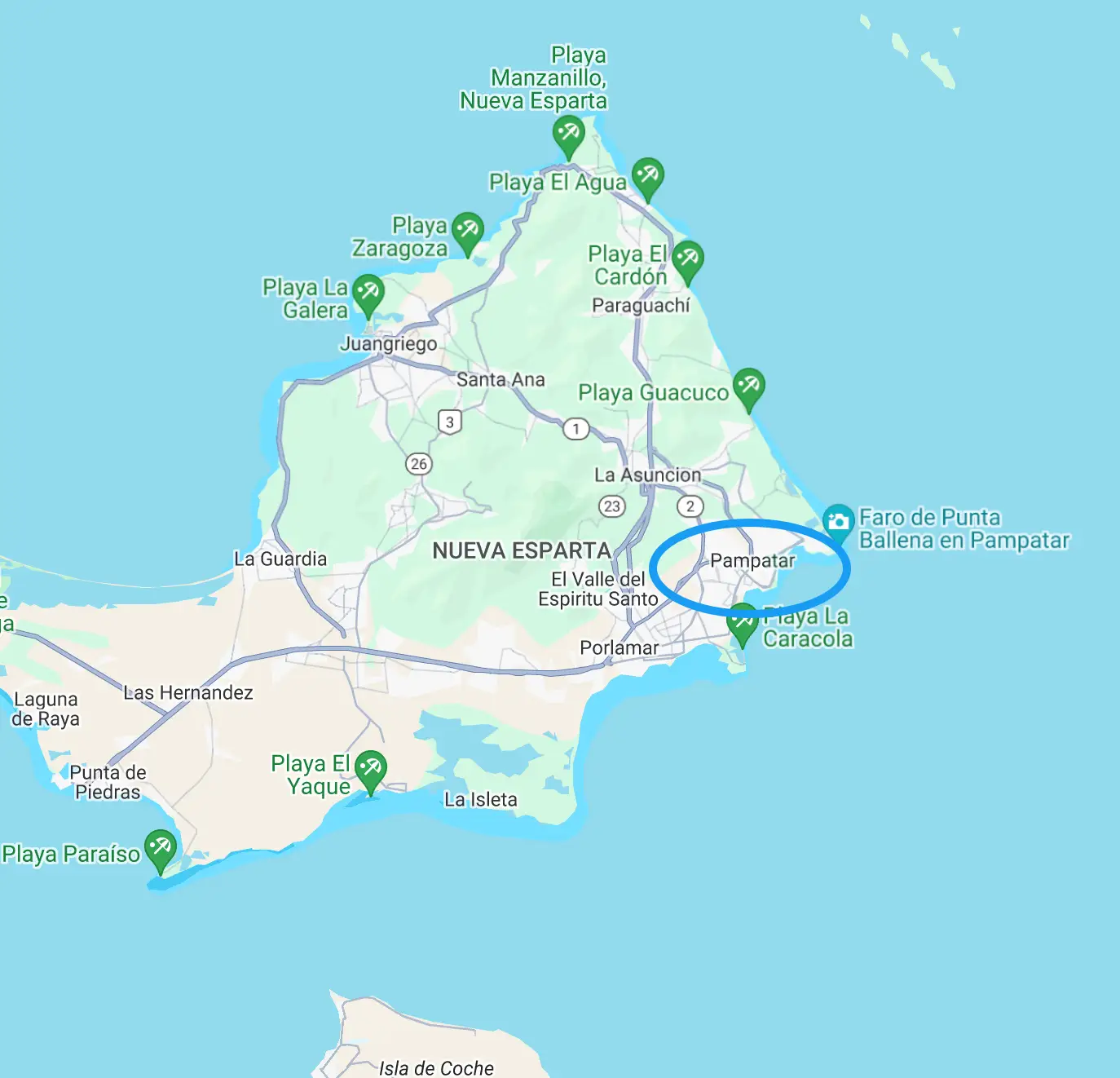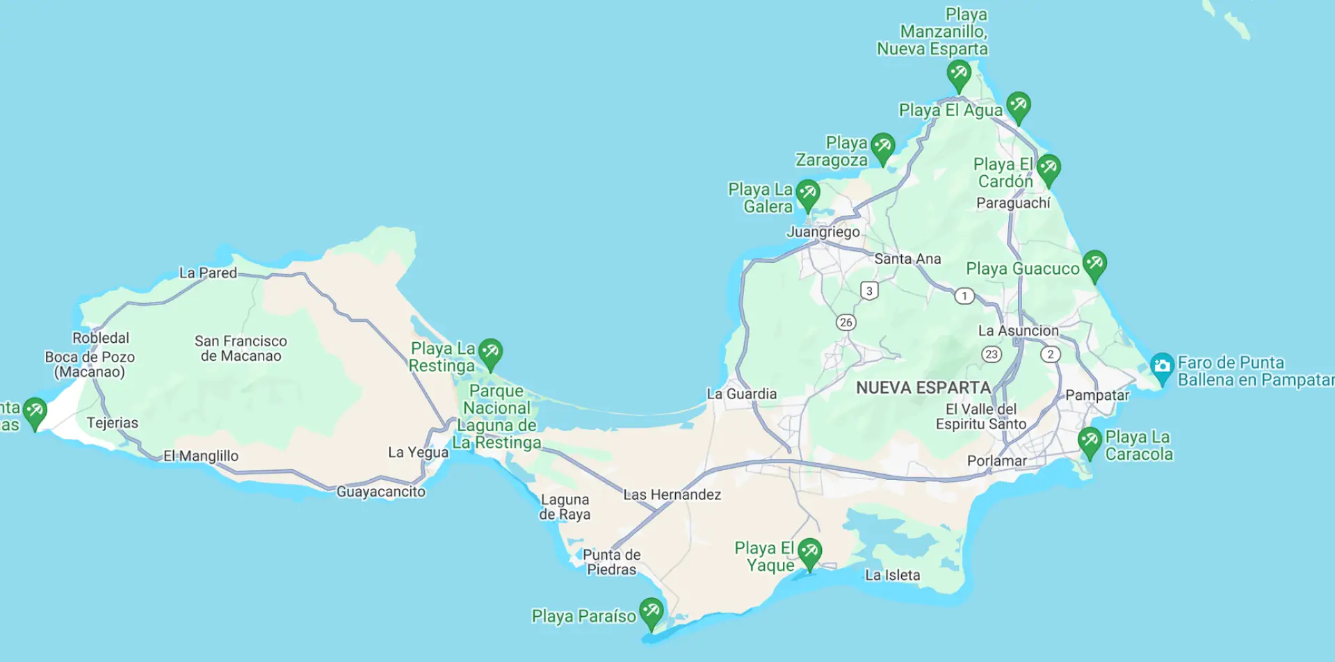 Margarita Island, located in the Caribbean Sea, 19 km north of the Península de Araya in northeastern Venezuela. Also known as the Isle of Pearls, Margarita is the largest of 70 islands comprising Nueva Esparta state. In reality two islands joined by a low narrow isthmus, Margarita is about 65 km long, covers an area of 1,072 square kms, and has a coastline of 319 km, with many natural harbours. The island is generally low, but the highest elevation, in the Cerros (mountains) del Macanao, reaches 760 metres.